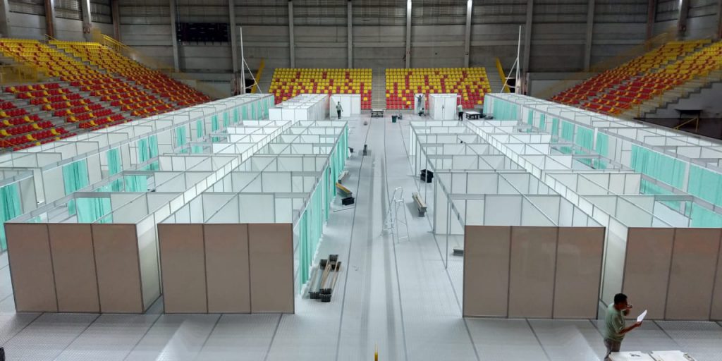 A montagem do hospital teve início no dia 4 de abril com a remoção do piso original da Arena e das grades, além da higienização e instalação de piso lavável adequado ao ambiente. As divisórias que fazem parte da estrutura de cada leito foram implantados nesta terça-feira (07). De acordo com a Secretaria da Saúde (SES), o hospital contará com 84 leitos.