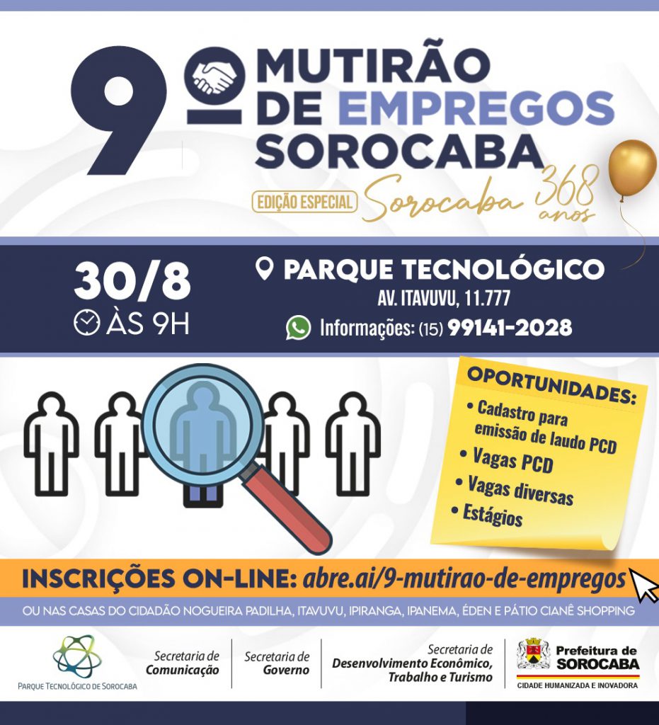 A Prefeitura de Sorocaba, por meio da Secretaria de Desenvolvimento, Trabalho e Turismo (Sedettur), com o apoio da Secretaria de Governo (Segov), Secretaria de Comunicação (Secom) e do Parque Tecnológico de Sorocaba (PTS), realizará, no dia 30 de agosto, às 9h, a 9ª edição do Mutirão de Empregos Sorocaba, desta vez, com o tema especial “Aniversário de Sorocaba” e trazendo também muitas vagas específicas para Pessoas com Deficiência (PCD), além de inscrições para a emissão de laudos para PCDs e vagas de estágio.