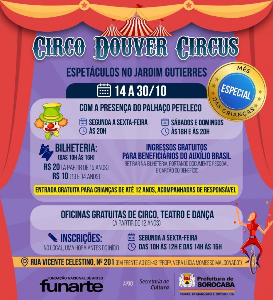 O Douver Circus promove, a partir desta sexta-feira (14), espetáculos e oficinas de Circo, Teatro e Dança, no bairro Jardim Gutierres, Zona Leste de Sorocaba. As atrações estarão disponíveis às famílias sorocabanas até o dia 30 de outubro. Em comemoração ao mês festivo, crianças de até 12 anos, acompanhadas de responsável, têm entrada gratuita.