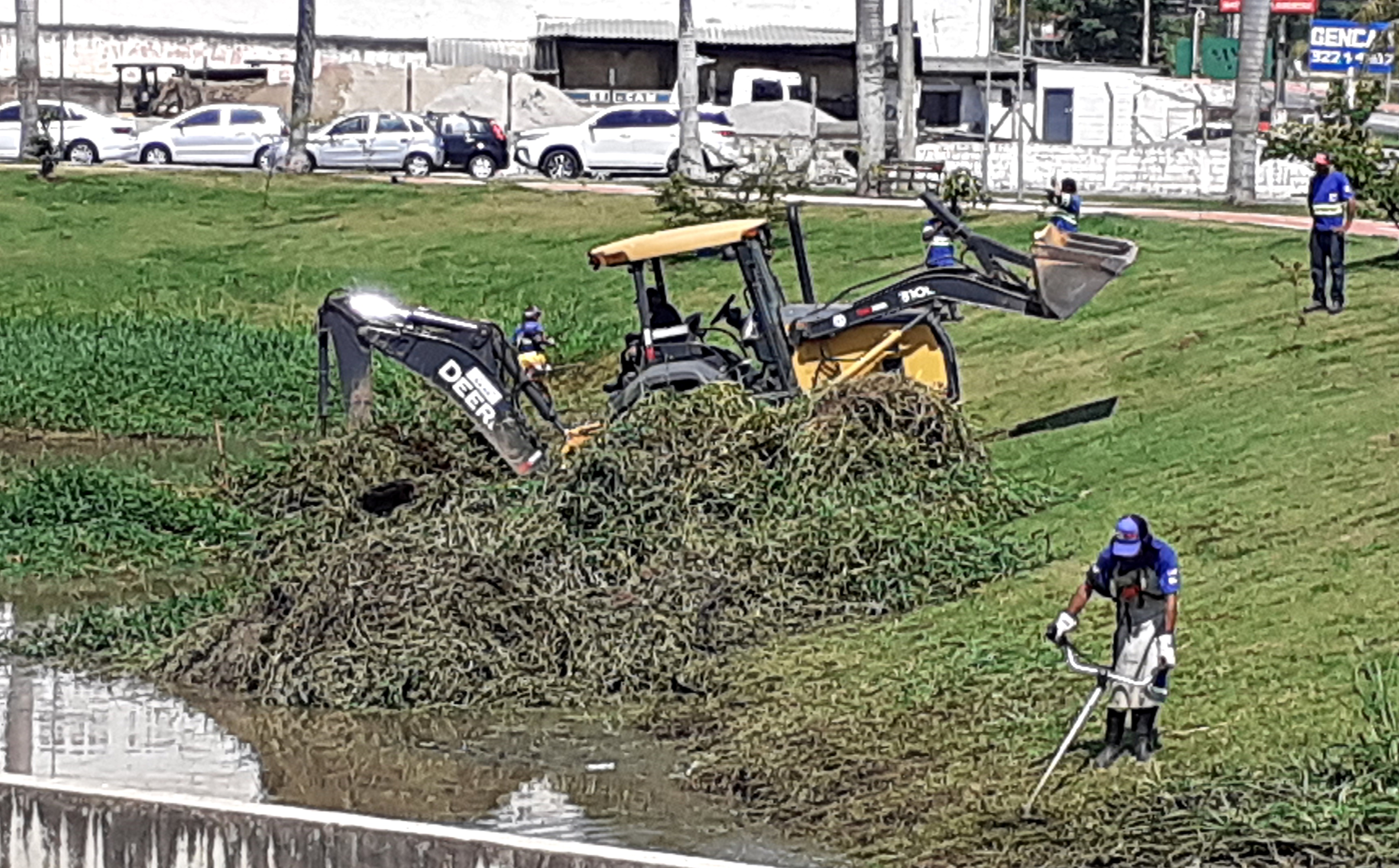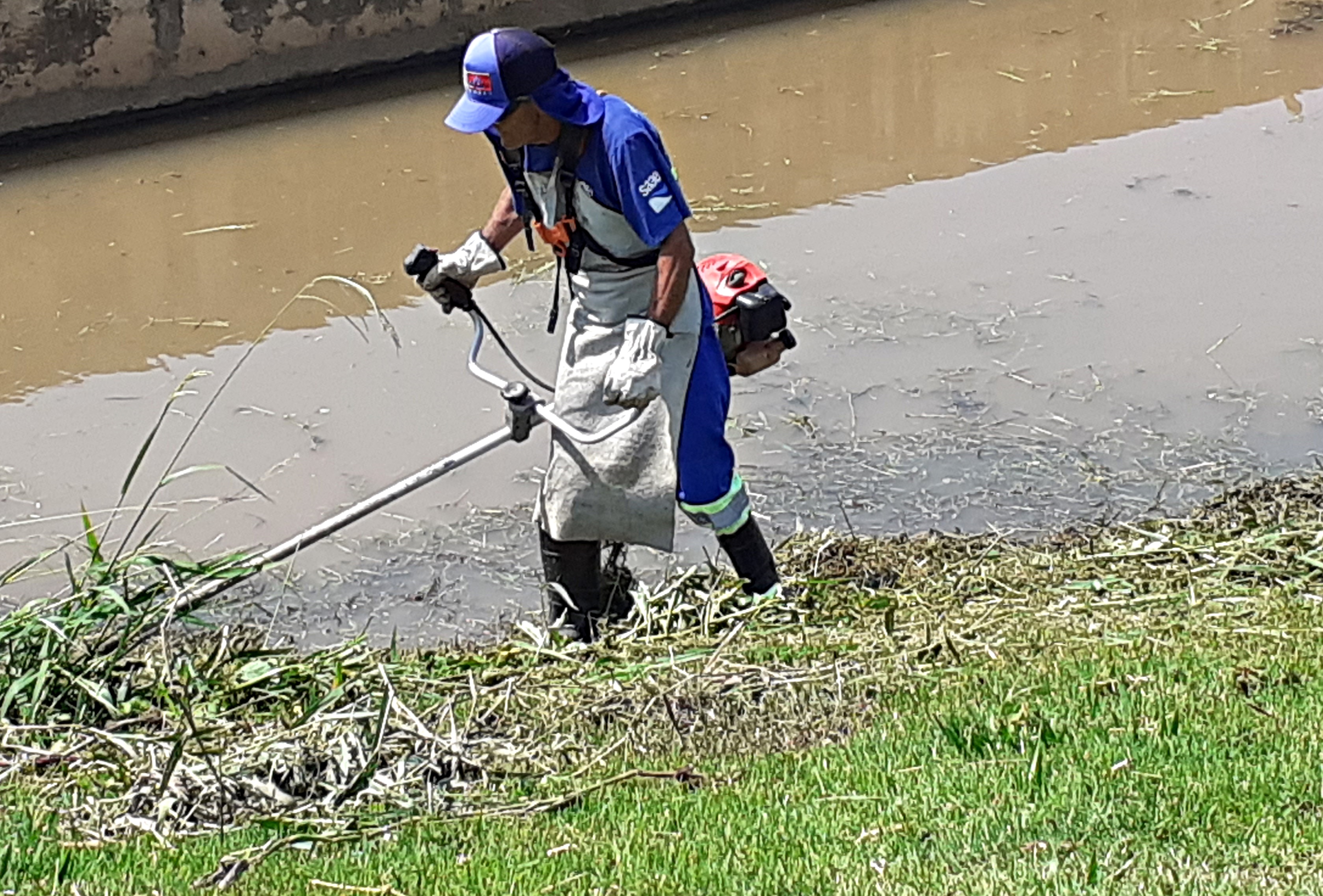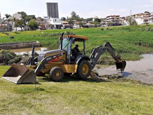 Na bacia 1 do RDC, localizado no cruzamento das avenidas Washington Luiz e Américo de Carvalho, no Jardim dos Estados, o trabalho está consistindo na roçagem do mato que se acumulou e na escavação e remoção dos bancos de areia que se acumularam, com o emprego de uma máquina retroescavadeira e caminhões para o transporte do material que vem sendo retirado e depositado em aterro apropriado.