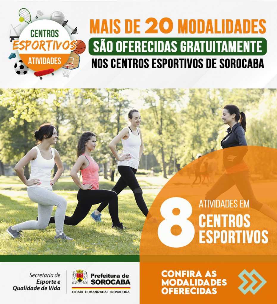 A Prefeitura de Sorocaba, por meio da Secretaria de Esporte e Qualidade de Vida (Sequav), oferece aulas gratuitas em Centros Esportivos da cidade, em mais de 20 modalidades diferentes para a prática de atividades físicas e esportivas, voltadas a pessoas de todas as idades.