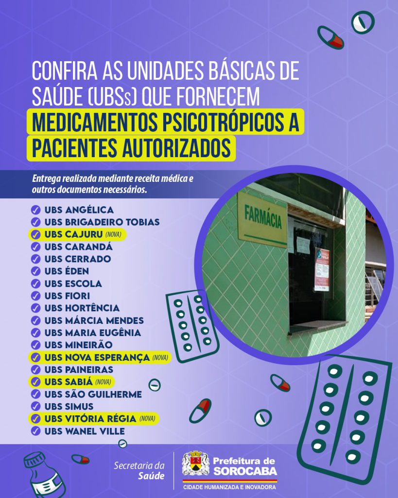 As farmácias das Unidades Básicas de Saúde (UBSs) Cajuru, Nova Esperança, Sabiá e Vitória Régia em Sorocaba passam, desde já, a fornecer medicamentos psicotrópicos a pacientes autorizados. Além dessas, outras 15 UBSs da cidade já fornecem esses remédios, sempre mediante receita médica e outros documentos necessários (confira, abaixo).