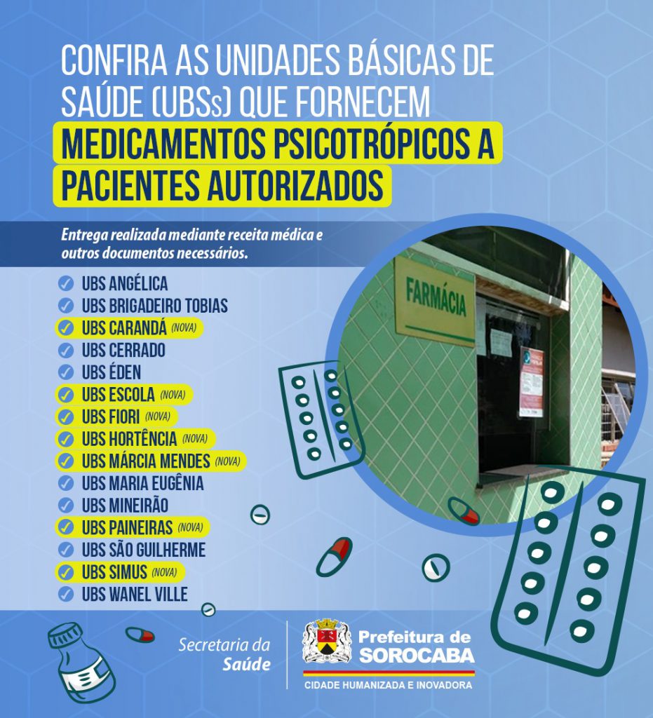 As farmácias das Unidades Básicas de Saúde (UBSs) Carandá, Escola, Fiori, Hortência, Marcia Mendes, Paineiras e Simus em Sorocaba passam, desde já, a fornecer medicamentos psicotrópicos a pacientes autorizados. Além dessas, outras oito UBSs da cidade já fornecem esses remédios, sempre mediante receita médica e outros documentos necessários (confira, abaixo), sendo elas: Cerrado, Angélica, Brigadeiro Tobias, Cerrado, Éden, Maria Eugênia, Mineirão, São Guilherme e Wanel Ville.