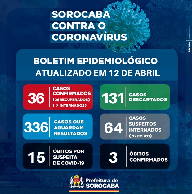 A Prefeitura de Sorocaba, por meio da Secretaria da Saúde (SES), registrou neste domingo mais um novo caso confirmado do novo coronavírus. Com isso, já são 36 casos confirmados na cidade. Deste total, sete estão internados (cinco em UTI) e 26 já se encontram recuperados. Além disso, três óbitos foram registrados por conta da doença.