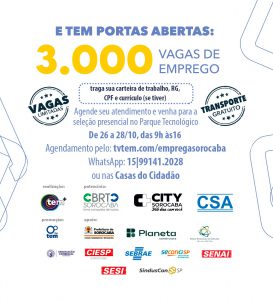 O megamutirão de empregos acontecerá até o dia 28 de outubro, em formato híbrido, disponibilizando capacitação on-line e gratuita e um mutirão presencial com vagas de emprego e entrevistas realizadas na hora, além de cadastramento de currículos para vagas futuras. A iniciativa tem patrocínio das empresas BRT Sorocaba, CSA e City Sorocaba e conta com a promoção da TV TEM.