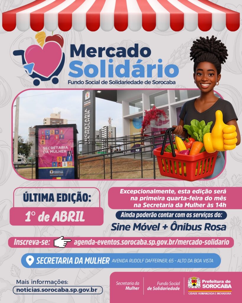 O Mercado Solidário é uma iniciativa promovida pela Secretaria da Mulher que tem como objetivo apoiar mulheres e famílias em situação de vulnerabilidade social, por meio da distribuição de alimentos e do fortalecimento de ações solidárias no município. As inscrições serão online, pelo link:  https://agenda-eventos.sorocaba.sp.gov.br/mercado-solidario/ .