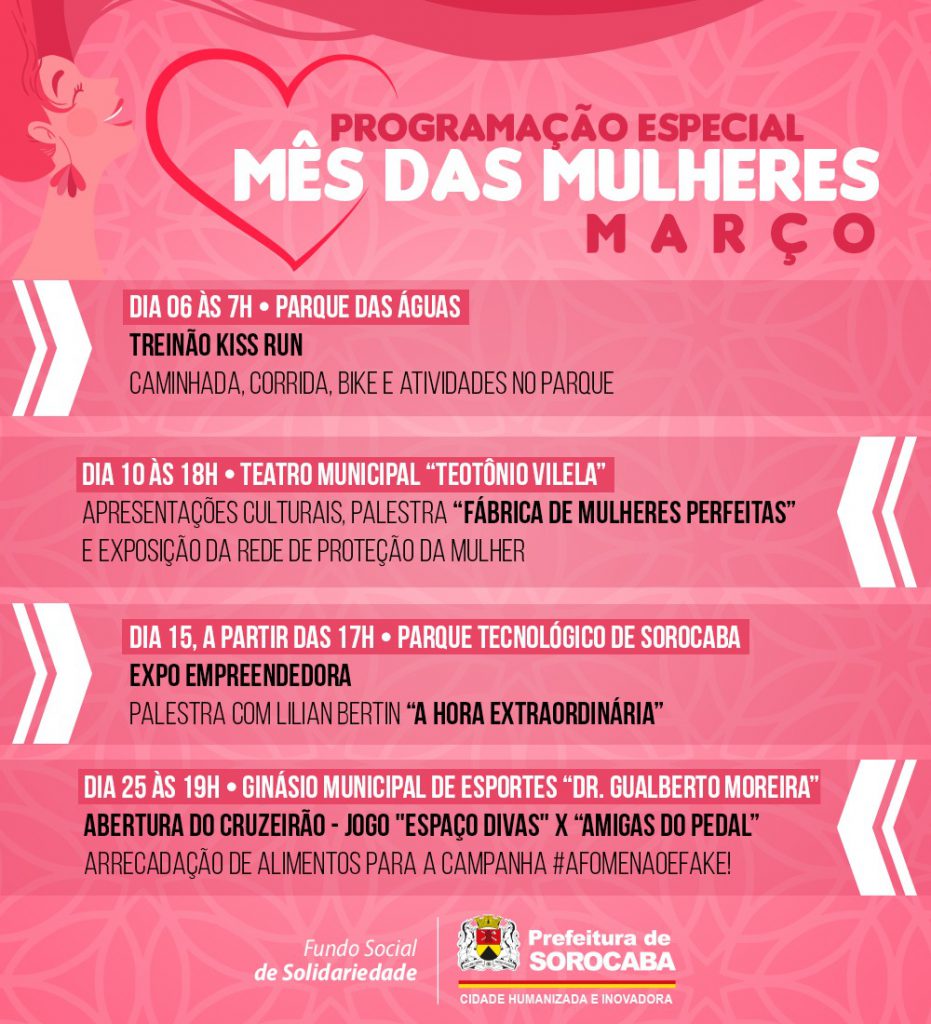 Com o apoio do Fundo Social de Solidariedade (FSS), presidido pela primeira-dama Sirlange Frate Maganhato, foi preparada uma programação especial para este mês de março na cidade de Sorocaba, em comemoração ao Dia das Mulheres (8 de março).