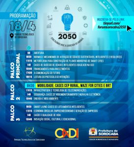 O “Fórum Sorocaba 2050” contará com uma série de palestras simultâneas, com conteúdos diversos e que debaterão as várias dimensões das cidades inteligentes, criativas, sustentáveis, humanizadas e inovadoras. As exposições serão feitas por especialistas, empreendedores e pesquisadores reconhecidos em suas áreas de atuação, com mediação de profissionais e autoridades convidados. Já, a abertura do evento, na noite do dia 17 de abril, contará com as presenças do prefeito de Sorocaba e presidente da RMS, Rodrigo Manga; do vice-governador do Estado de São Paulo, Felício Ramuth; de deputados estaduais e federais, prefeitos, vice-prefeitos, secretários municipais e vereadores de toda a região; do presidente do PTS, Nelson Cancellara; de representantes do Instituto Áquila e do Grupo Bandeirantes de Comunicação, realizadores do “Prêmio Band Cidade Excelentes”, além de outros convidados e participantes dessa grande iniciativa.