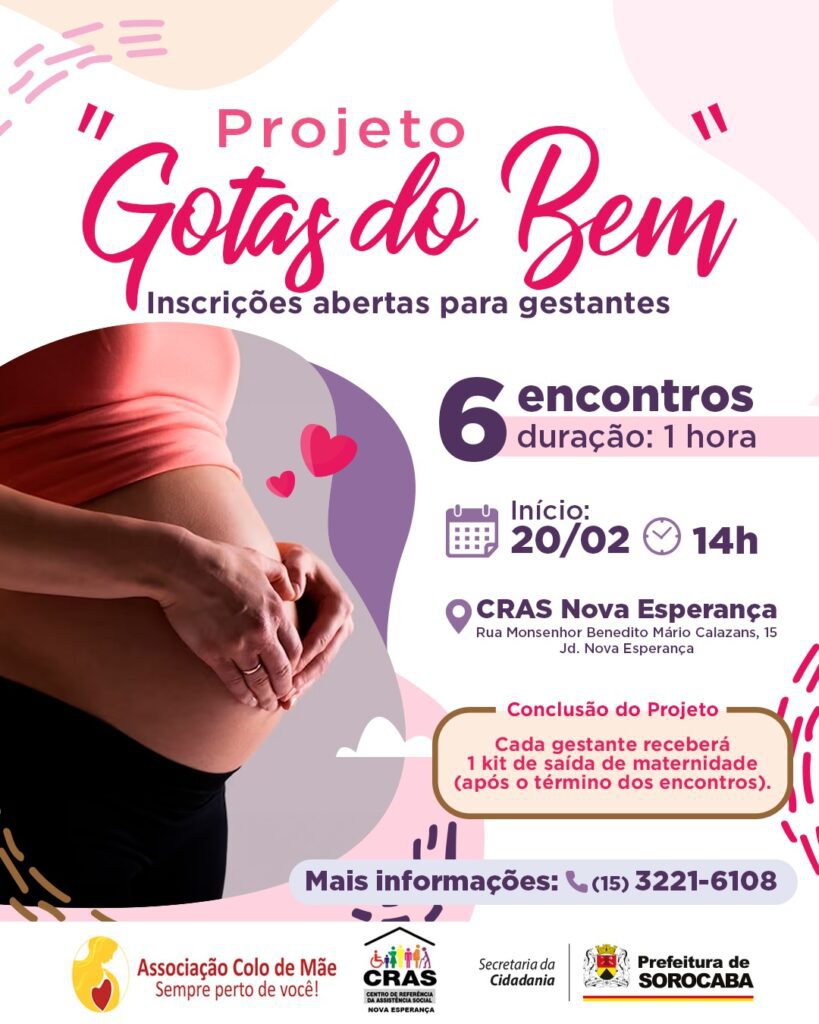 O Centro de Referência em Assistência Social (CRAS) Nova Esperança, em parceria com a Associação Colo de Mãe, convida as mulheres gestantes, usuárias dessa unidade, para participarem do Projeto Gotas do Bem.