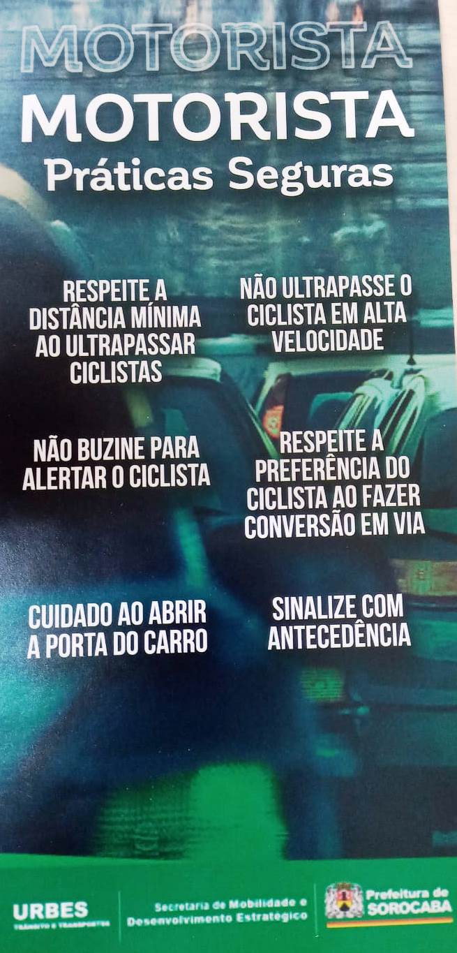 “A ação foi positiva e os motoristas receberam folhetos informativos, contendo dicas de como condutores e ciclistas devem atuar com segurança no trânsito, de forma a evitar acidentes”, destacou a gerente de Educação para o Trânsito da Urbes, Cibele Soares.