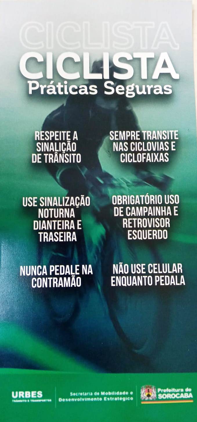 Já, os ciclistas são orientados a respeitar a sinalização de trânsito; sempre transitar nas ciclovias e ciclofaixas; usar sinalização noturna dianteira e traseira; nunca pedalar na contramão; não usar celular enquanto pedala e respeitar o uso obrigatório de campainha e retrovisor esquerdo.