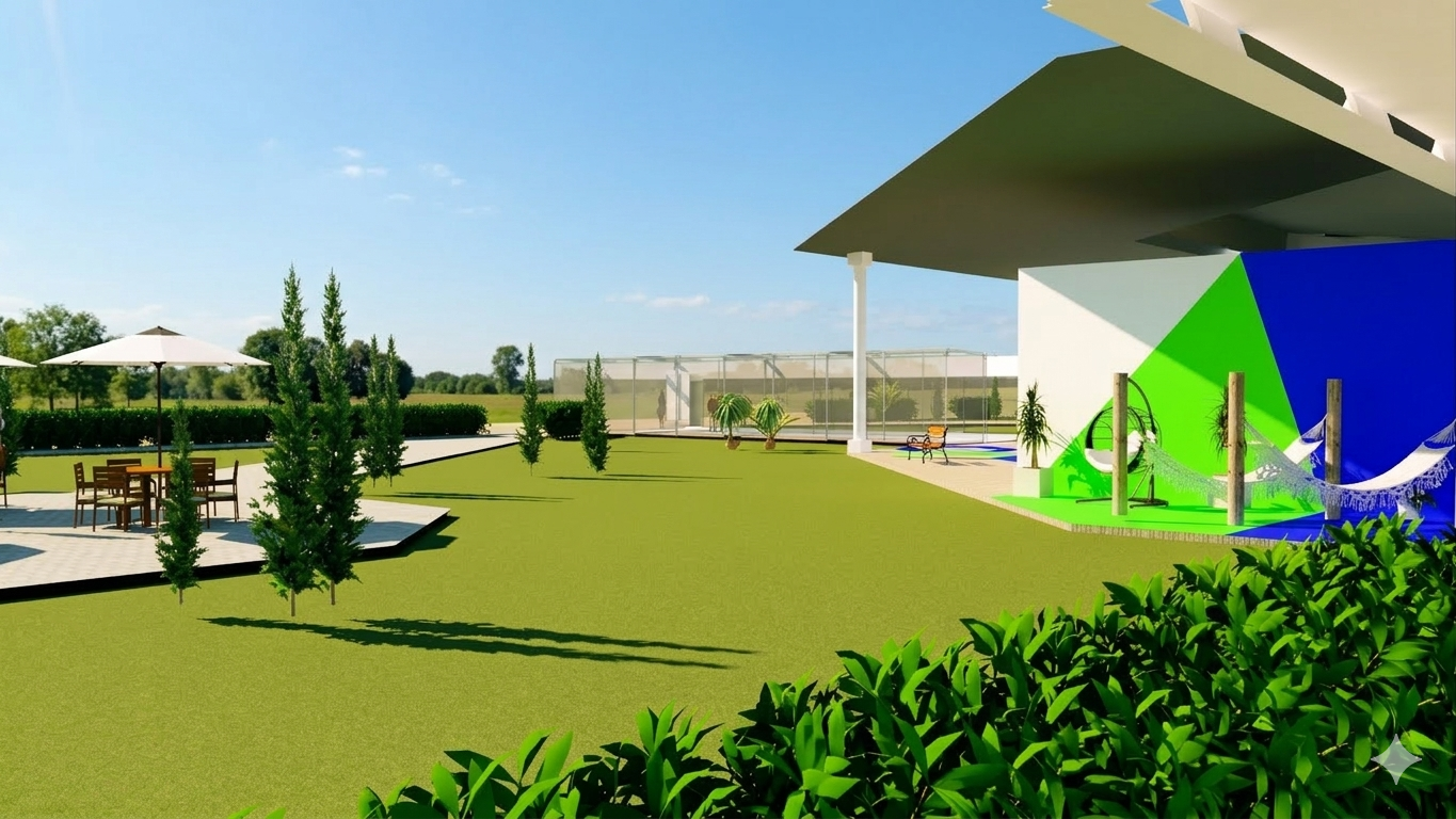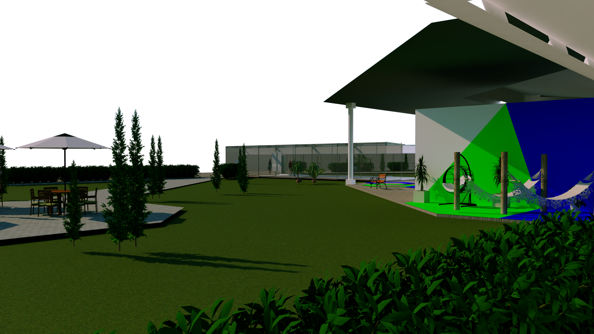 Convivência ao ar livre: mesas, cadeiras, ombrelones (semelhantes a guarda-sóis) e deck;