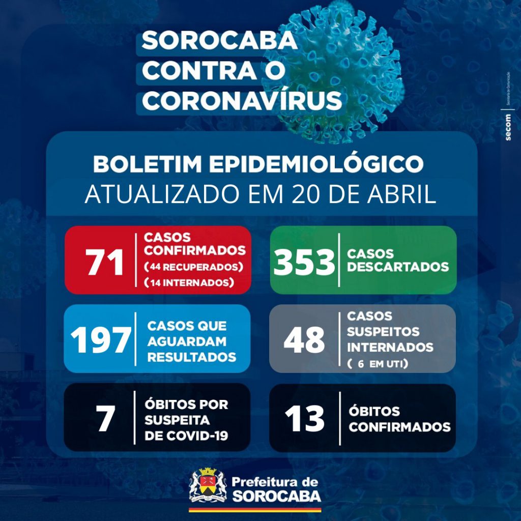 Também nesta segunda-feira a cidade de Sorocaba contabilizou mais seis novos confirmados da Covid-19. Com isso já são 71 casos confirmados na cidade. Deste total, 14 estão internados (seis em UTI) e 44 já se encontram recuperados.