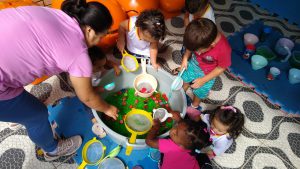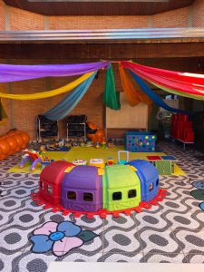 Semanalmente, os auxiliares de Educação organizam espaços e elementos especiais para o brincar dos bebês e das crianças pequenas, que criam, fantasiam, se divertem e se desenvolvem, à medida que os profissionais realizam intervenções com base nas necessidades de cada grupo.
