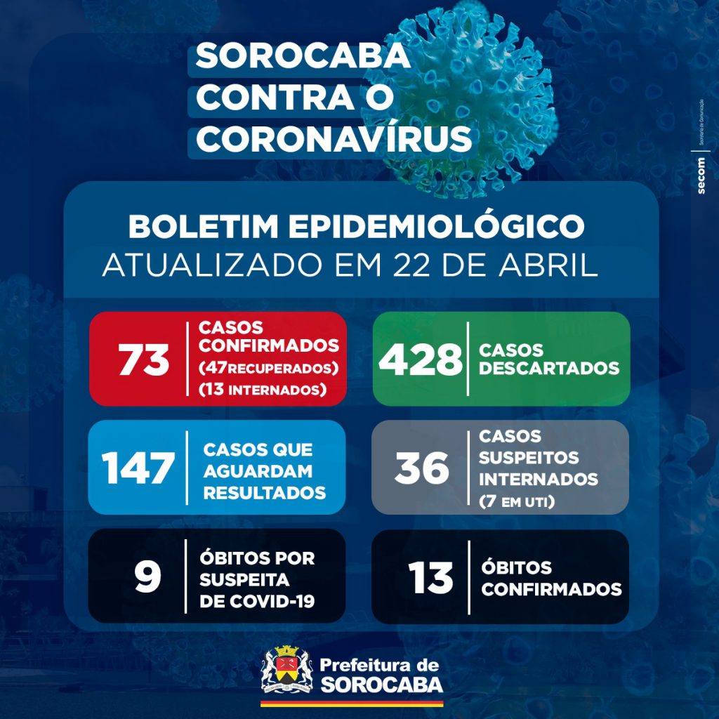 A Prefeitura de Sorocaba, por meio da Secretaria da Saúde (SES), registrou mais dois novos casos confirmados com a COVID-19 nesta quarta-feira (22). Com isso, já são 73 casos confirmados na cidade. Deste total, 13 estão internados (seis em UTI) e 47 já se encontram recuperados. Além disso, 13 óbitos foram registrados por conta da doença.