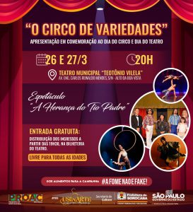 “Circo de Variedades” tem continuidade no próximo mês. Nos dias 9, 10, 16 e 17 de abril, a atração será realizada na Usinarte, que está localizada na Alameda das Margaridas, 415, no Jardim Simus. Já, nos dias 23 e 24 de abril, a apresentação acontecerá novamente no Teatro Municipal.