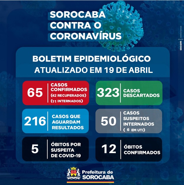 Também neste domingo a cidade de Sorocaba contabilizou mais três novos confirmados da Covid-19. Com isso já são 65 casos confirmados na cidade. Deste total, 11 estão internados (seis em UTI) e 42 já se encontram recuperados.