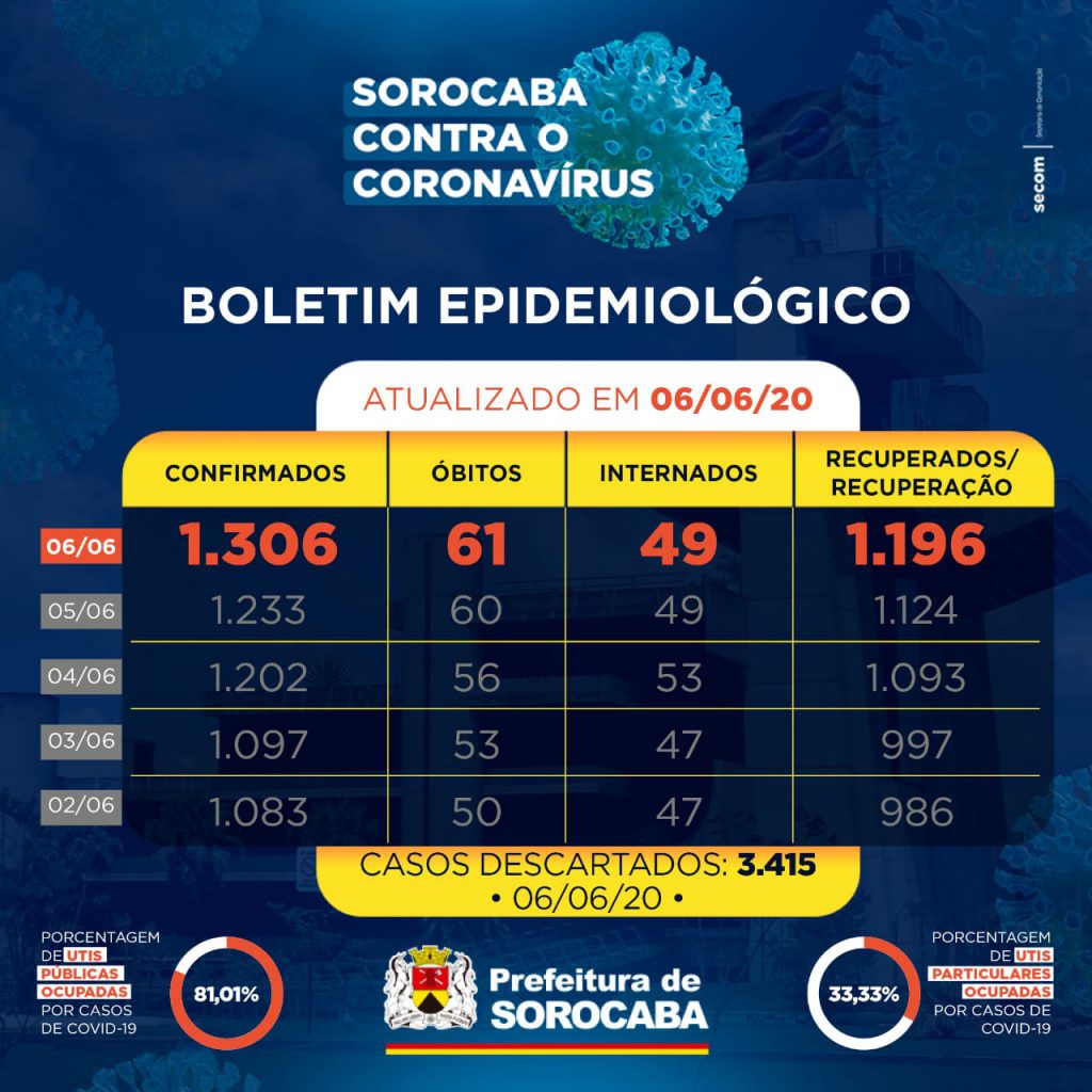 Sorocaba recebeu a notificação de mais 73 novos casos confirmados da Covid-19 neste sábado (06). Com isso, a cidade chegou ao total de 1.306 casos. Deste total, 49 estão internados (15 em UTI) e o total de recuperados e/ou em estado de recuperação passou para 1.196.