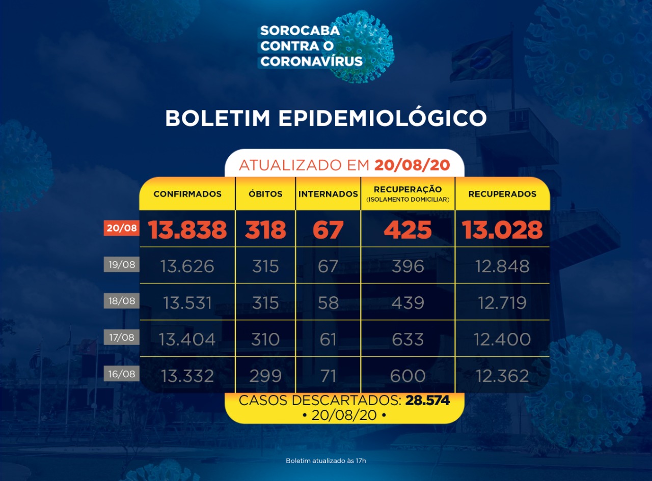 A Prefeitura de Sorocaba, por meio da Secretaria da Saúde (SES), registrou 13.028 recuperados da Covid-19, nesta quinta-feira (20). Já os casos confirmados com a doença passaram de 13.626 para 13.838 na cidade. Os óbitos com a confirmação da doença aumentaram para 318.