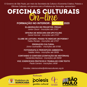 Estão abertas até a primeira quinzena de agosto as inscrições para participação às novas oficinas culturais on-line, promovidas pela Secretaria de Estado da Cultura e Economia Criativa; Poiesis e Oficinas Culturais, em parceria com a Prefeitura de Sorocaba, por meio da Secretaria da Cultura (Secult).
