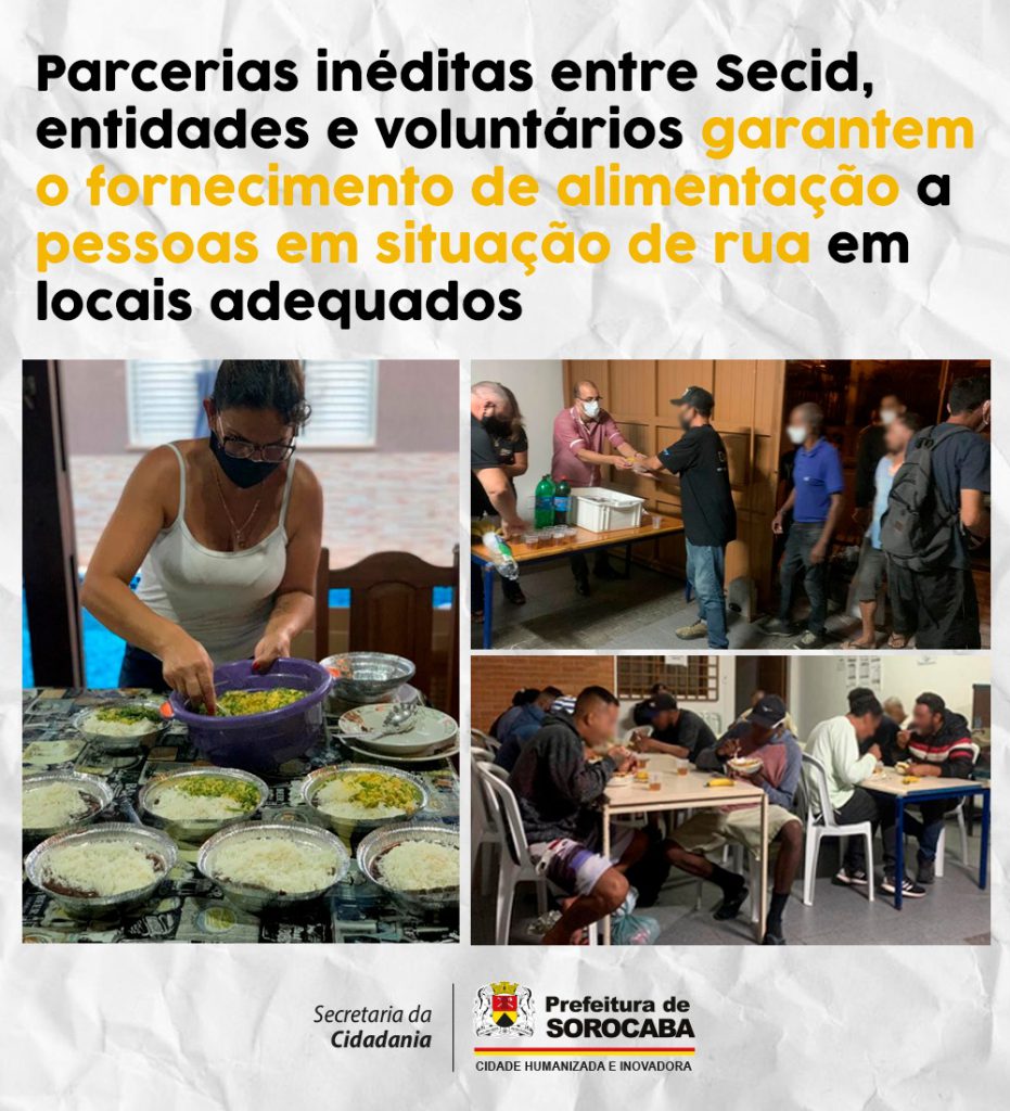 E graças às várias parcerias estabelecidas entre a Secretaria da Cidadania (Secid), entidades assistenciais e grupos de voluntários, tem sido possível garantir o fornecimento diário de alimentação completa a essas pessoas em locais adequados, como no Centro de Triagem e no SOS, as quais são abordadas socialmente nos mais diversos pontos e regiões da cidade.