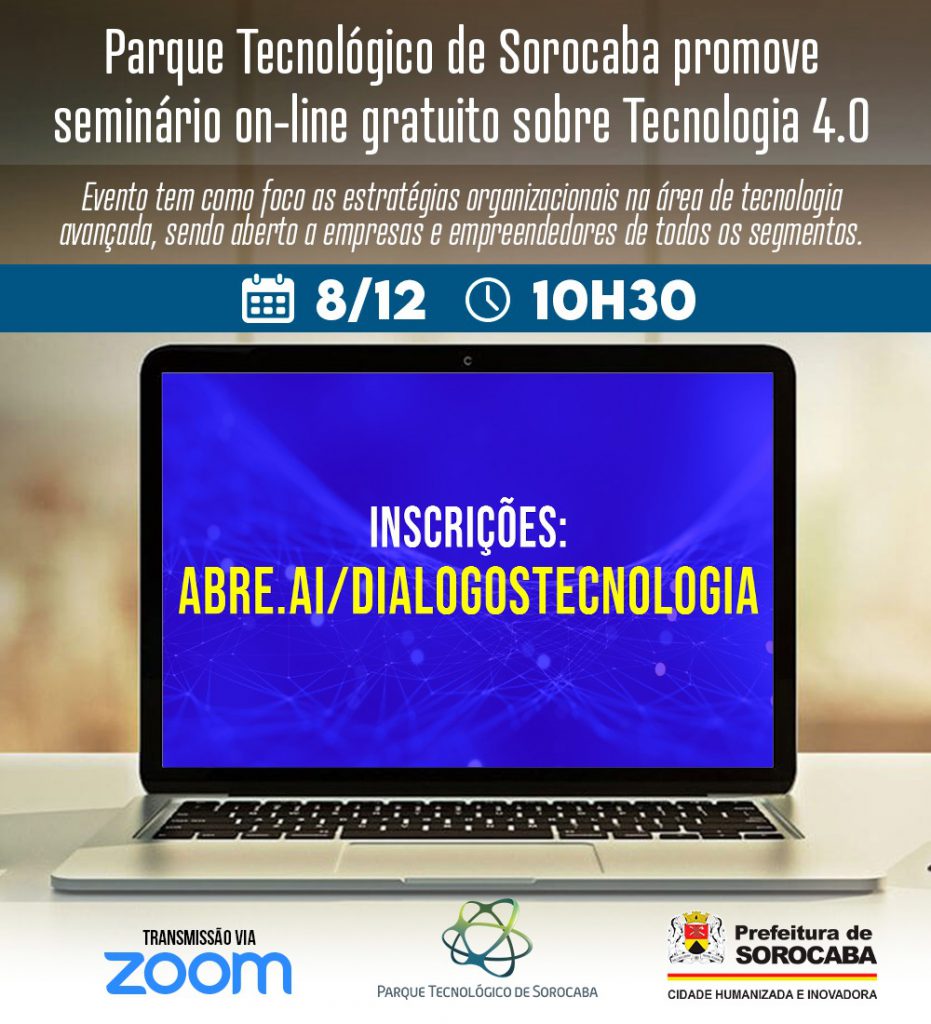 A Prefeitura de Sorocaba, por meio do Parque Tecnológico (PTS), realizará, nesta quinta-feira (8), a partir das 10h30, o seminário on-line gratuito “Diálogos da Tecnologia 4.0: Estratégia Organizacional”. O objetivo é reunir especialistas e empresários para uma discussão sobre estratégias de implantação de Tecnologias 4.0, incluindo a proposição de metas, formas de superação de desafios e aumento da competitividade.