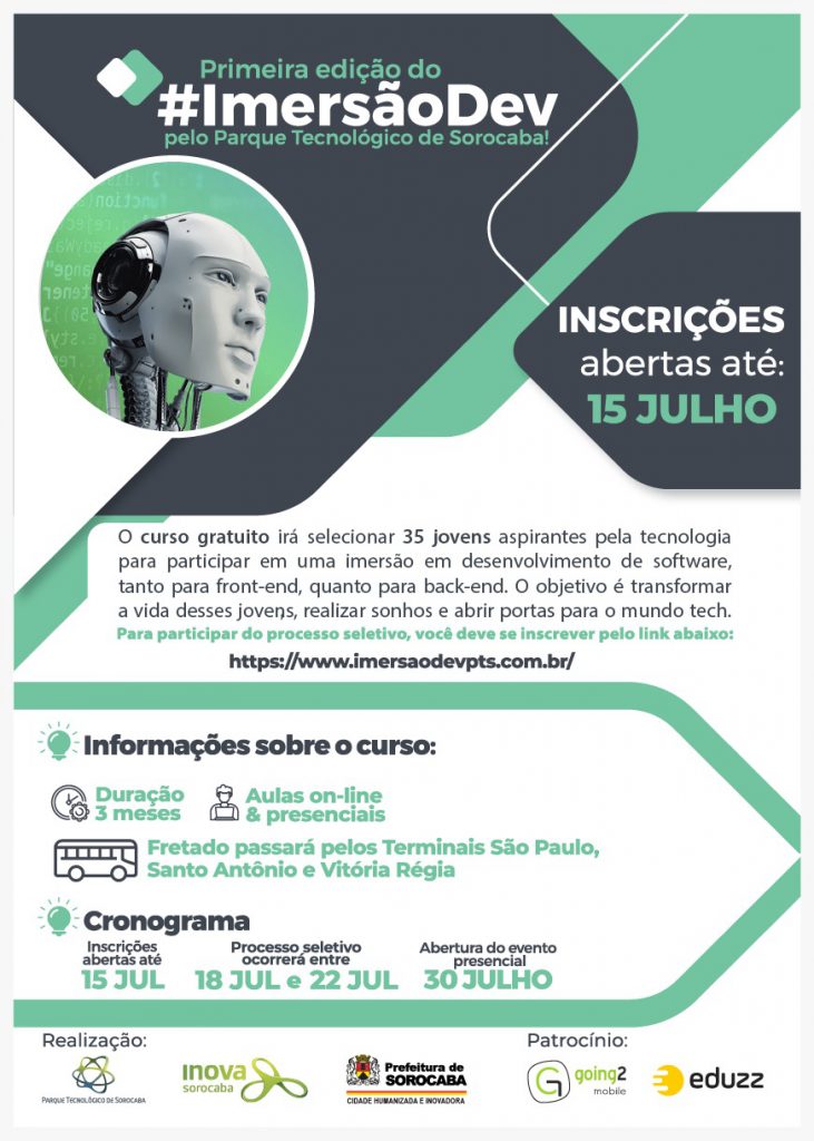 A Prefeitura de Sorocaba, por meio do Parque Tecnológico de Sorocaba (PTS), proporciona a participação dos interessados em um curso imersivo gratuito na área de desenvolvimento de software. Trata-se da iniciativa “Imersão Dev”, que é um programa de formação de desenvolvedores juniores, com período de três meses de duração.