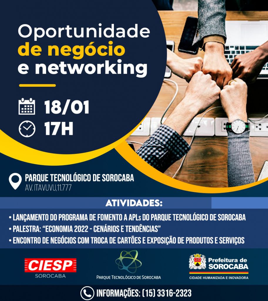 Empresários e empreendedores da Região Metropolitana de Sorocaba (RMS) terão a oportunidade de ampliar o networking e formular estratégias para 2022 no Encontro de Negócios e Lançamento do Programa de Fomento aos Arranjos Produtivos Locais (APLs). O evento acontece no próximo dia 18, às 17h, no Parque Tecnológico de Sorocaba (PTS).