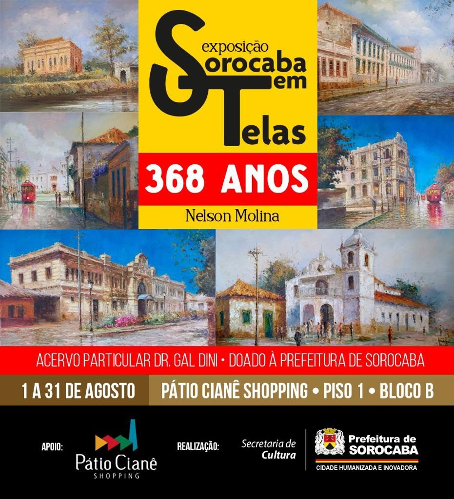 A exposição “Sorocaba em telas – 368 Anos” já está em cartaz, no Pátio Cianê Shopping, com 18 obras do artista plástico Nelson Molina, todas produzidas na técnica espatulada. A mostra gratuita pode ser visitada no Espaço Cultural Cianê, no Bloco B do Piso 1 do empreendimento, até o dia 31 de agosto.