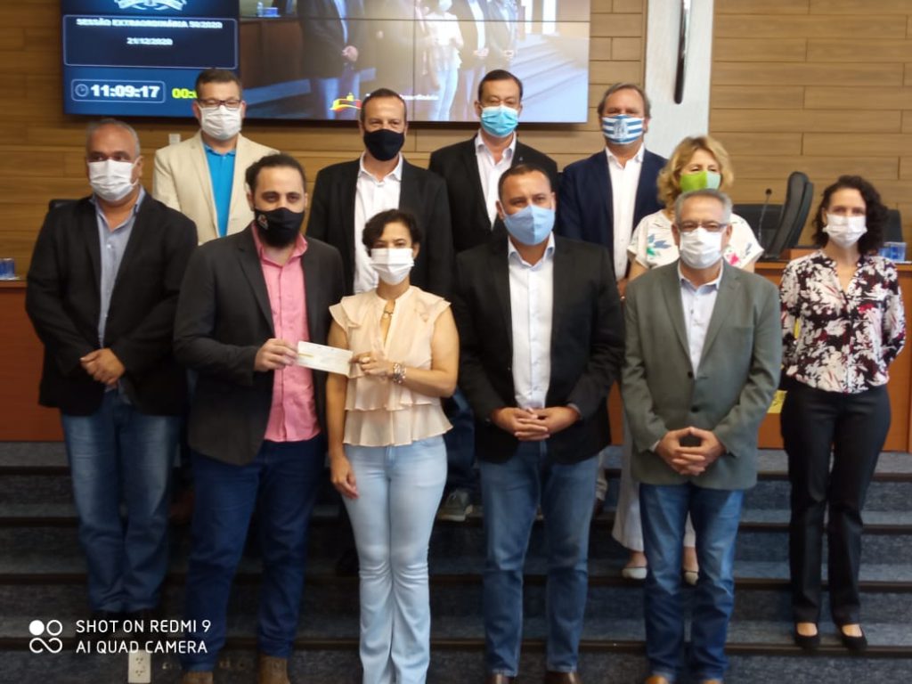 A prefeita Jaqueline Coutinho esteve na Câmara Municipal de Sorocaba na manhã desta segunda-feira (21) para receber, das mãos do presidente do Legislativo, vereador Fernando Dini, um cheque no valor de R$ 5 milhões. Os recursos devolvidos aos cofres da Prefeitura fazem parte do duodécimo repassado mensalmente pelo Executivo para o Legislativo e são consequência do esforço da Câmara na questão dos cortes e otimização dos gastos. Durante a cerimônia que contou com a presença de outros vereadores – que participavam de uma sessão extraordinária, Fernando Dini anunciou para os próximos dias a devolução de um novo valor, de cerca de R$ 2 milhões para a Prefeitura.