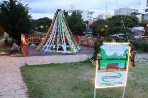 A Coopereso montou uma linda árvore no local, feita com garrafas PET recicladas, além de iluminar toda a praça, com pisca-piscas nos monumentos e pontes.