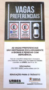 A ação consiste em anexar folhetos explicativos nos retrovisores dos veículos, assim como entregá-los para pedestres e motoristas. O material traz o seguinte alerta: “Quando um espaço é ocupado indevidamente, atrapalha!”. Também informa que o uso da vaga é prioridade para deficiente físico ou idoso, desde que este tenha a credencial emitida pela Urbes – Trânsito e Transportes.