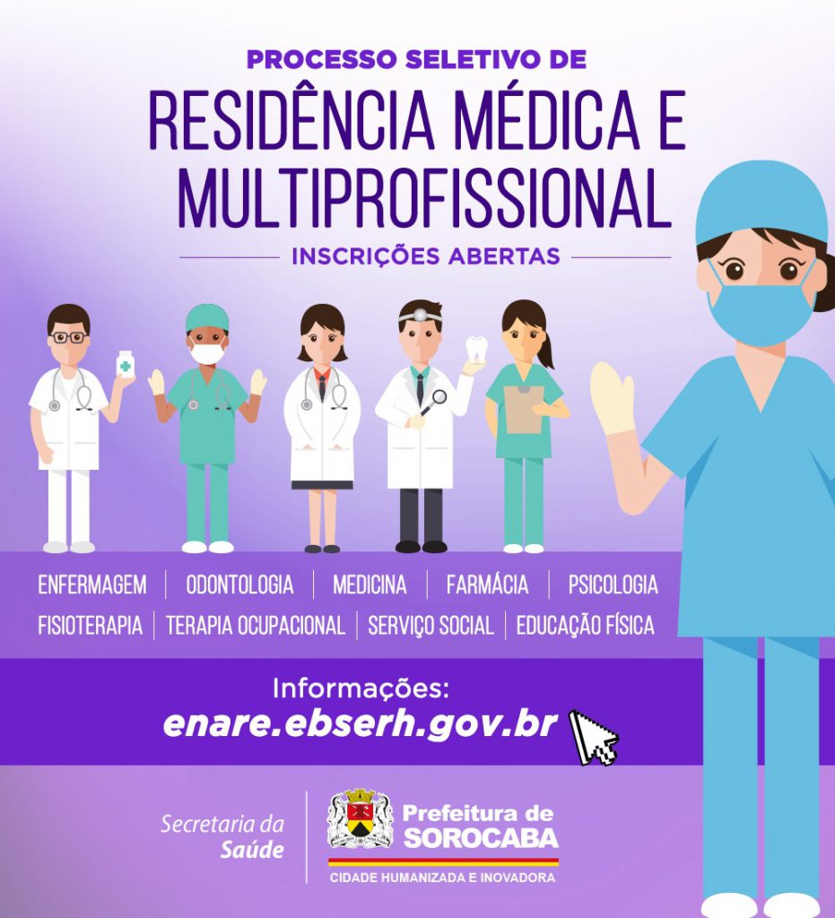 A Prefeitura de Sorocaba, por meio da Secretaria da Saúde (SES), divulga, nesta quinta-feira (1), novo processo seletivo para novas turmas dos Programas de Residência Médica e Multiprofissional em Saúde. Ao todo, são oferecidas mais 38 vagas, sendo quatro em Residência de Medicina de Família e Comunidade, três em Psiquiatria, além de 32 em Residência Multiprofissional, sendo, destas, 22 em Saúde da Família e Comunidade e 10 em Saúde Mental.