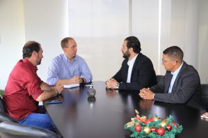 O prefeito Rodrigo Manga, acompanhado do secretário de Desenvolvimento Econômico, Trabalho e Turismo (Sedettur), Paulo Henrique Marcelo, recepcionou os representantes do Grupo Nós, Victor Simões, Head de Real State e Relacionamento Institucional e Governamental da empresa, e Rafael Vilaça, Head de Controles Internos, Riscos e Compliance.