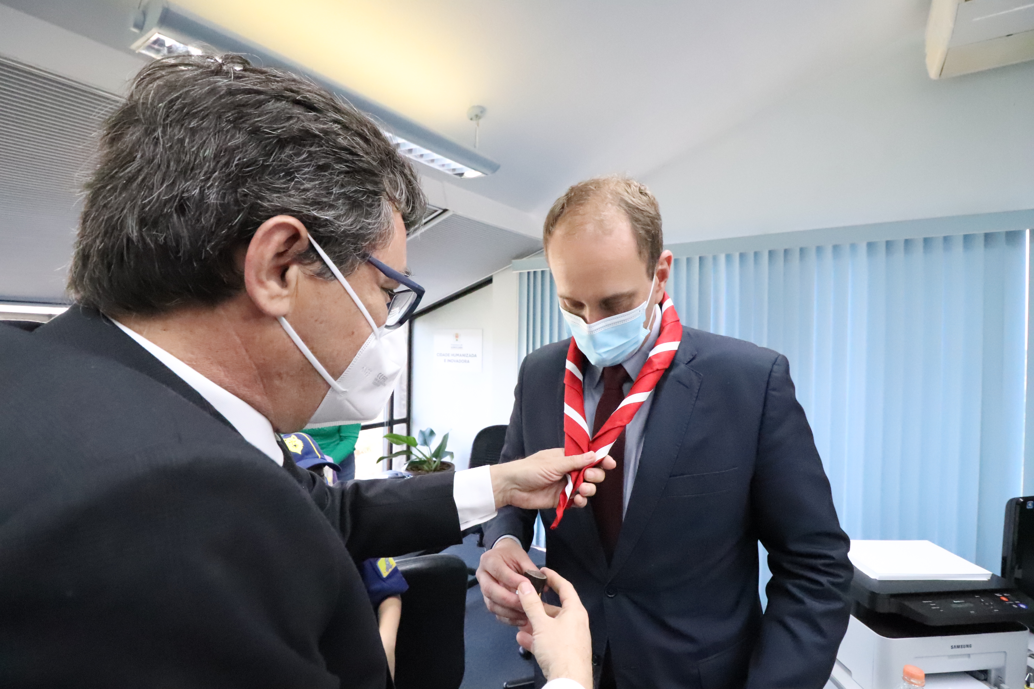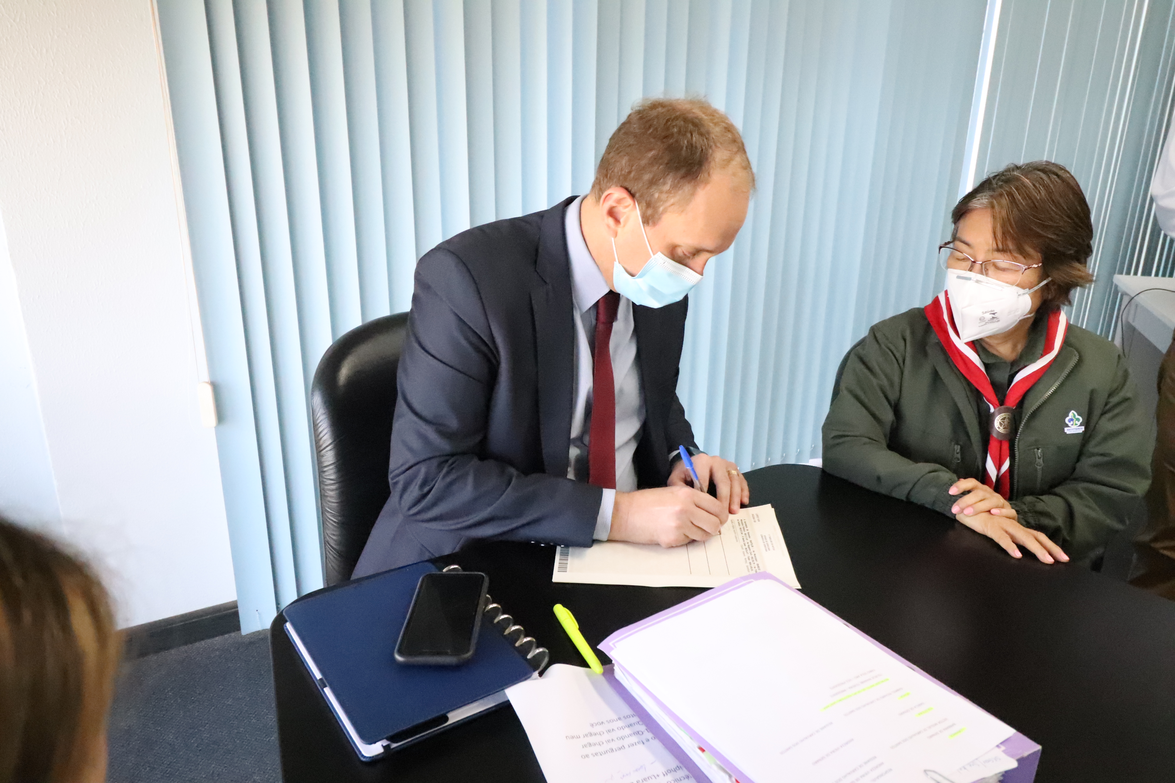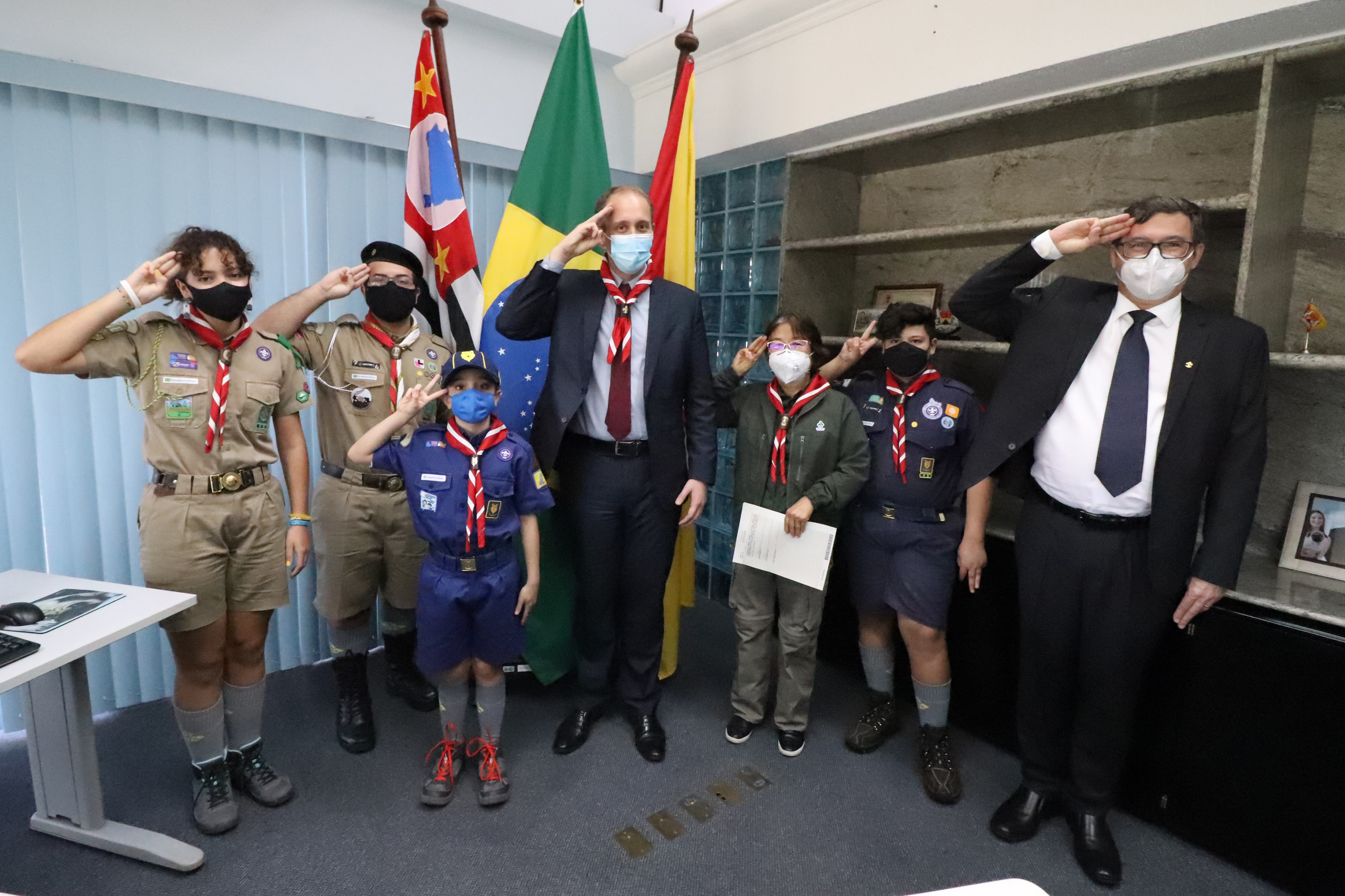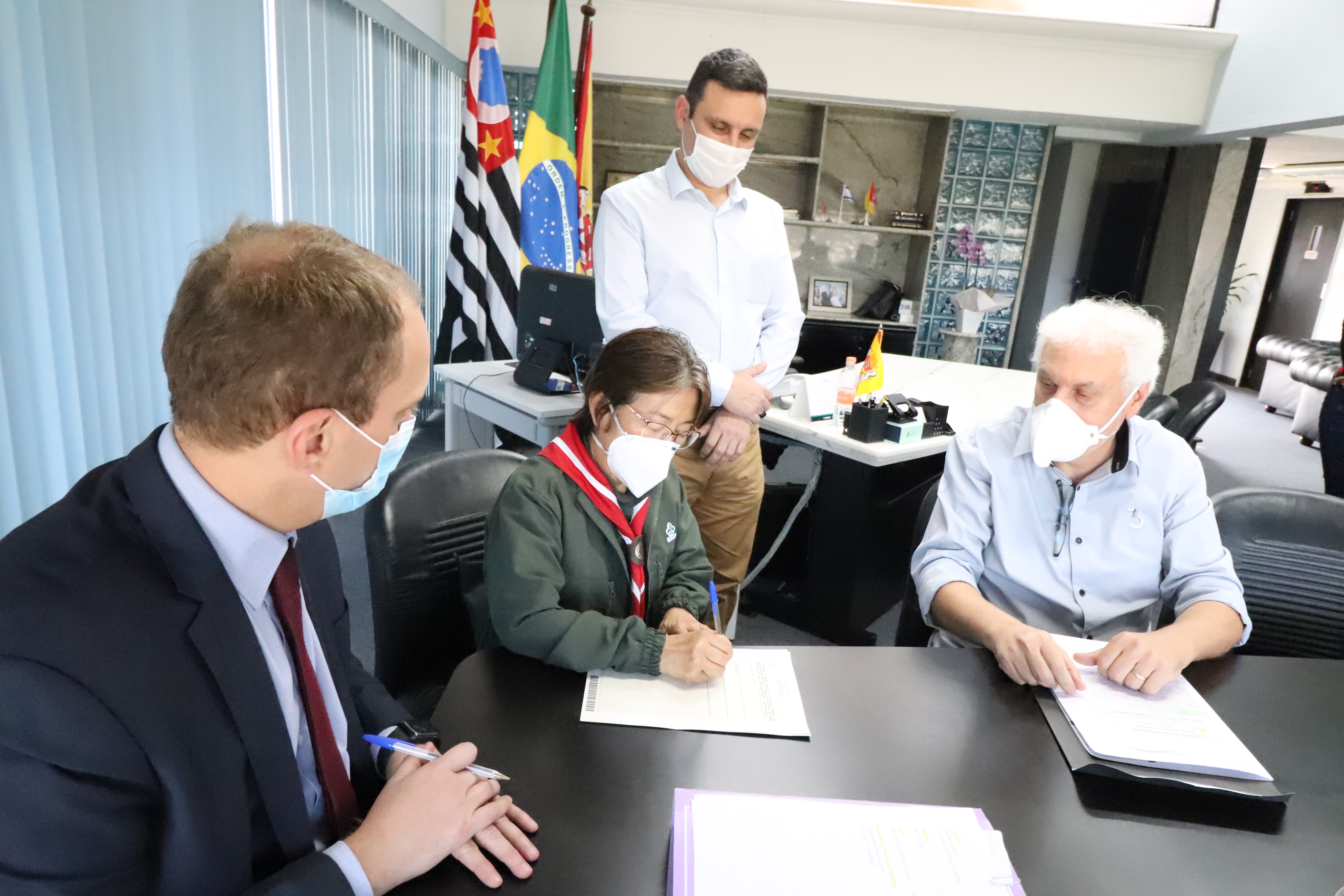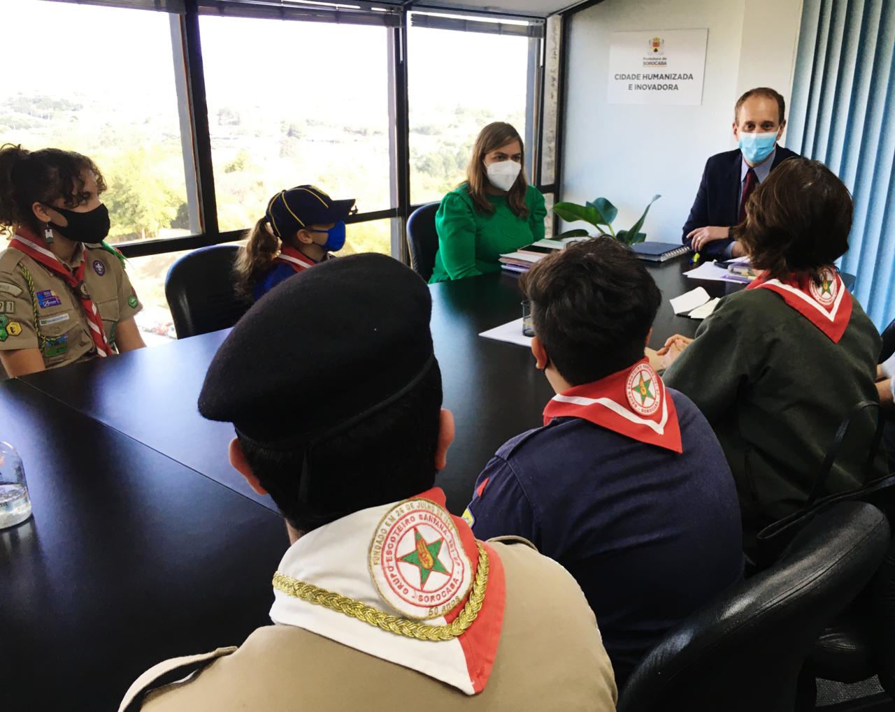 Participaram também da reunião a secretária Jurídica, Dra. Luciana Mendes; a presidente do Grupo Escoteiro Santana, Tsurue Manabe Teixeira, conhecida como Ester; o tabelião Cláudio Martins, do 3º Tabelionato de Notas de Sorocaba, e crianças escoteiras do Grupo Escoteiro Santana.