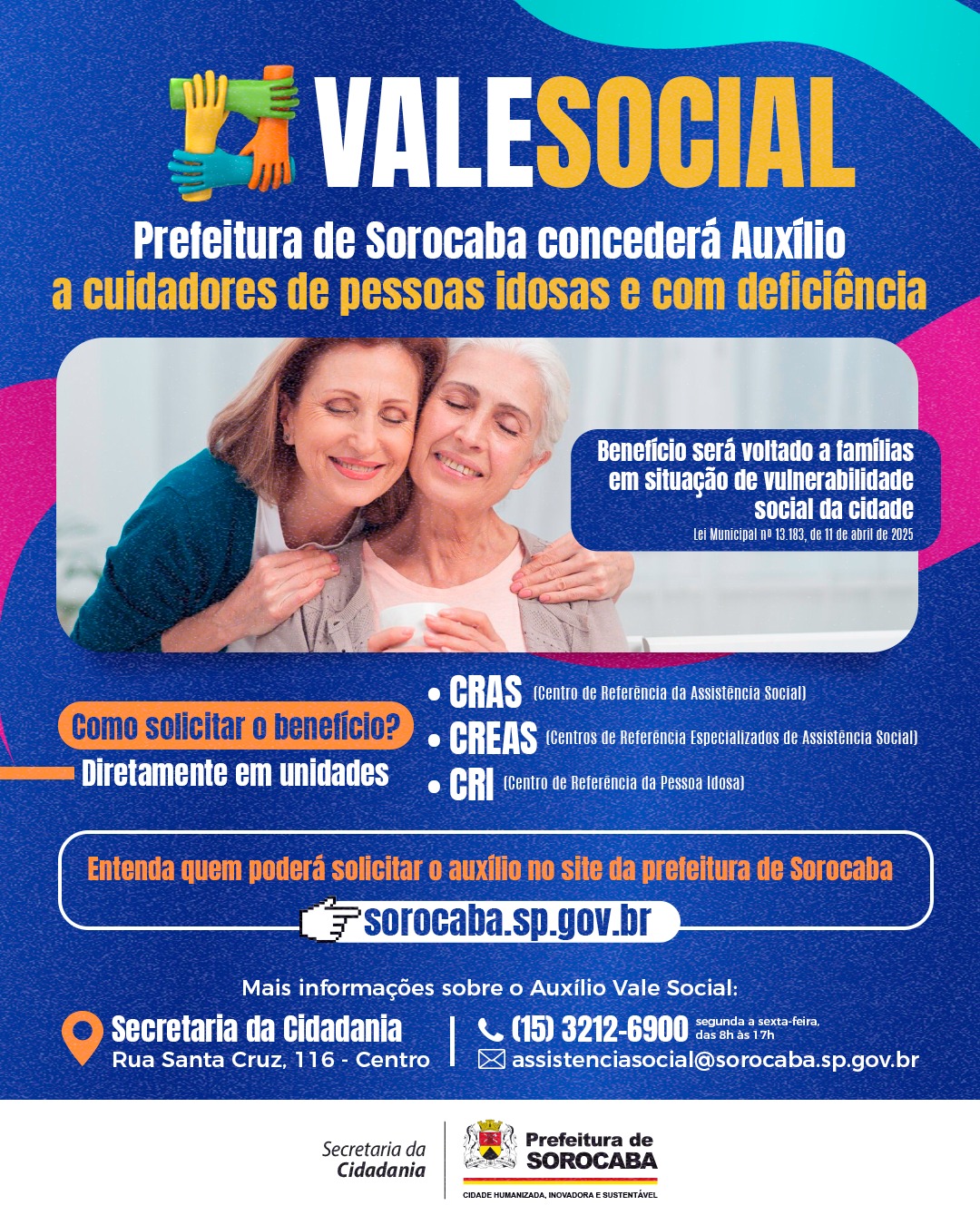 A Prefeitura de Sorocaba, por meio da Secretaria da Cidadania (Secid), concederá o Auxílio Vale Social, no valor de um salário-mínimo por mês, a cuidadores que se dedicam integralmente ao acompanhamento de pessoas idosas ou com deficiência. em condição de dependência. O benefício será concedido a responsáveis legais que não exerçam atividade remunerada, há pelo menos dois anos, e se encontrem em situação de vulnerabilidade social.