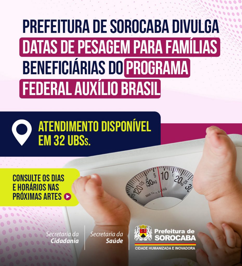 A Prefeitura de Sorocaba, por meio da Secretaria da Cidadania (Secid), reforça a necessidade de as famílias que são beneficiárias do programa federal Auxílio Brasil (antigo Bolsa Família) realizarem a pesagem requerida de crianças e mulheres até o fim deste mês de junho, em uma das Unidades Básicas de Saúde (UBSs) da cidade.