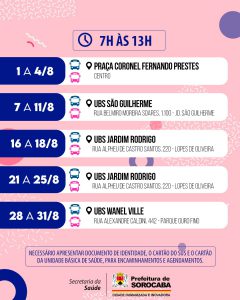 Nos dias 1, 2, 3 e 4, os Ônibus Azul e Rosa assistirão a população na Praça Coronel Fernando Prestes, no Centro. Nos dias 7, 8, 9, 10 e 11, as duas unidades móveis realizarão os atendimentos na UBS São Guilherme, na Rua Belmiro Moreira Soares, 1.100, no Jardim São Guilherme.