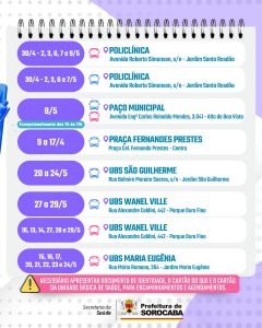 Nos dias 9, 10, 13, 14, 15, 16 e 17, o Ônibus Azul atenderá a população na Praça Fernandes Prestes, no Centro. Nos dias 20, 21, 22, 23 e 24, a unidade móvel realizará atendimentos na UBS São Guilherme, localizada na Rua Belmiro Moreira Soares, s/n, no Jardim São Guilherme. Ainda, nos dias 27, 28 e 29, é a vez da UBS Wanel Ville, localizada na Rua Alexandre Caldini, 442, no Parque Ouro Fino.