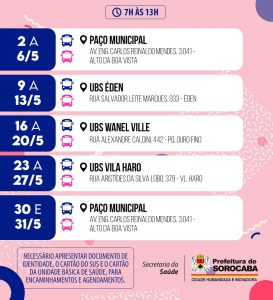 Nos dias 2, 3, 4, 5 e 6 de maio, os Ônibus Azul e Rosa assistirão a população no Paço Municipal, na Avenida Engenheiro Reinaldo Mendes, 3.041, Alto da Boa Vista. Nos dias 9, 10, 11, 12 e 13 de maio, as unidades realizarão os atendimentos na UBS Éden, situada na Rua Salvador Leite Marques, 933, no Éden.