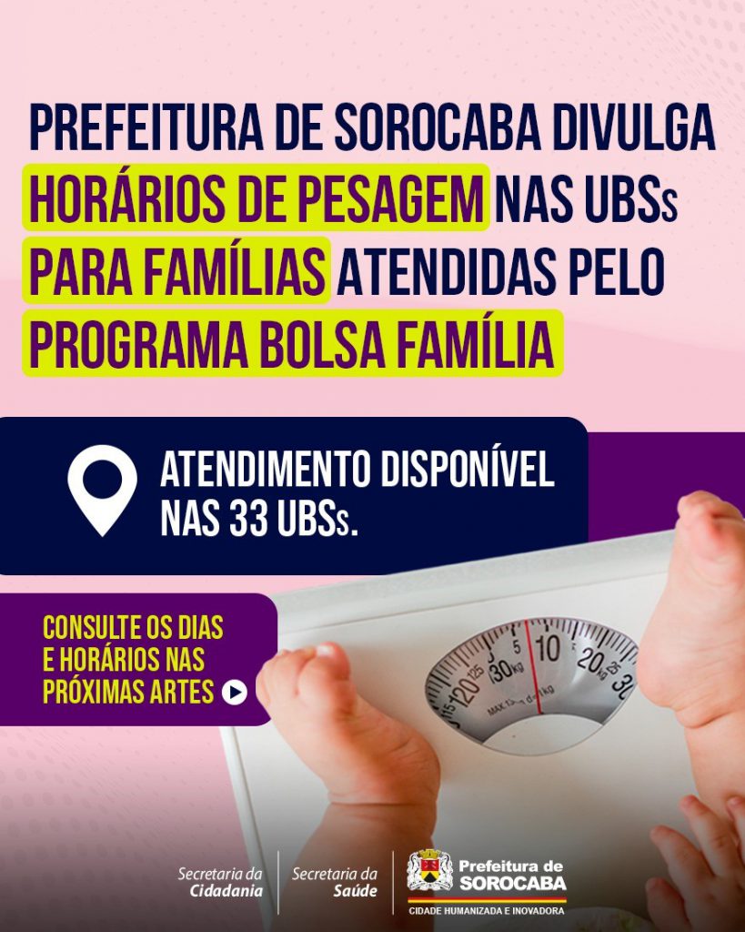 A Prefeitura de Sorocaba, por meio da Secretaria da Cidadania (Secid), divulga os dias e os horários disponíveis nas UBSs (Unidades Básicas de Saúde), para que as famílias registradas no Cadastro Único (CadÚnico) e beneficiárias do programa federal Bolsa Família possam realizar a pesagem solicitada a mulheres e crianças. A pesagem pode ser feita na UBS mais próxima da residência de cada família, conforme datas e horários relacionados nas artes a seguir.