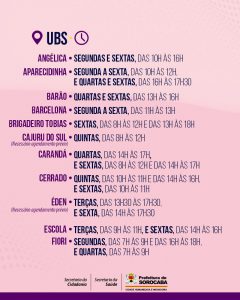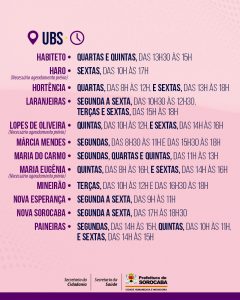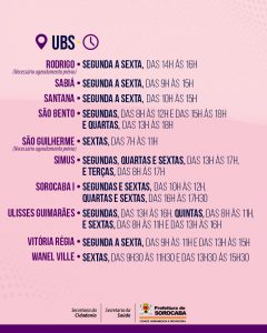 A Prefeitura de Sorocaba, por meio da Secretaria da Cidadania (Secid), divulga os dias e os horários disponíveis nas UBSs (Unidades Básicas de Saúde), para que as famílias registradas no Cadastro Único (CadÚnico) e beneficiárias do programa federal Bolsa Família possam realizar a pesagem solicitada a mulheres e crianças. A pesagem pode ser feita na UBS mais próxima da residência de cada família, conforme datas e horários relacionados nas artes a seguir.