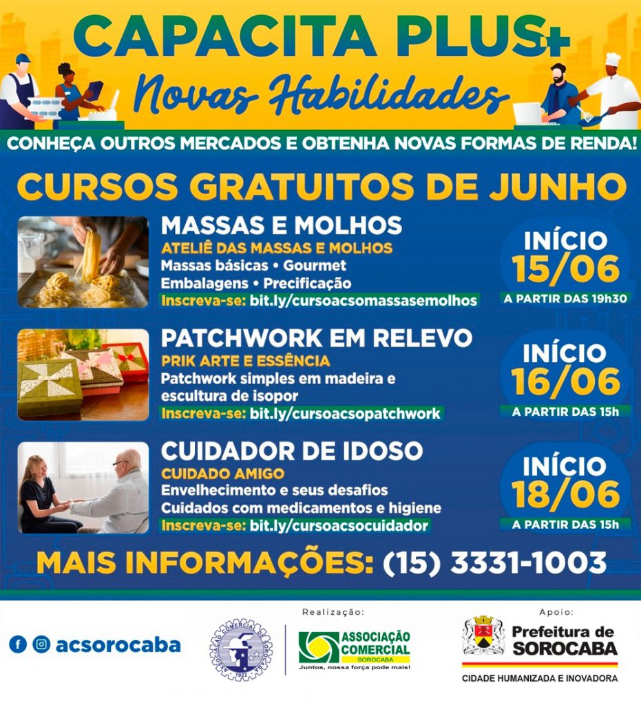 A Prefeitura de Sorocaba, por meio da Secretaria de Desenvolvimento Econômico, Trabalho e Turismo (Sedettur), em apoio à Associação Comercial de Sorocaba (ACSO), disponibilizará três novos cursos on-line e gratuitos. Os treinamentos fazem parte do programa Capacita Plus Novas Habilidades.