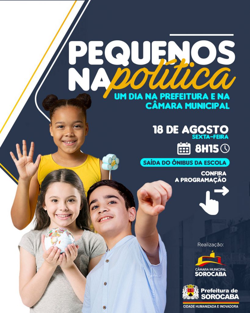 Em comemoração ao aniversário de 369 anos da cidade de Sorocaba, cerca de 30 alunos da Escola Municipal “Tadeusz Josefczyk” participarão, no dia 18 de agosto (sexta-feira), do projeto “Pequenos na Política: um dia na Câmara e na Prefeitura”, um roteiro educativo que visa aproximar as crianças dos poderes Legislativo e Executivo.