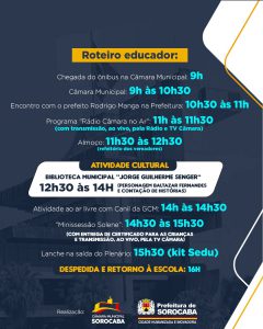 A programação do dia será repleta de atividades educativas. Os alunos serão recebidos na Câmara Municipal, onde aprenderão sobre o funcionamento do Legislativo e sua importância para a cidade. Além disso, as crianças terão a oportunidade única de participar de uma “Minissessão Solene”, com transmissão, ao vivo, pela TV Câmara, quando ainda receberão certificados de participação. Também na Câmara Municipal, os estudantes participarão, ao vivo, do programa “Rádio Câmara no Ar”.