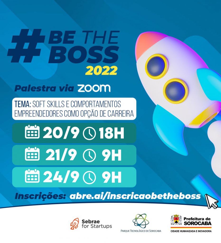 Dando continuidade ao programa #BeTheBoss (BTB) 2022, a Prefeitura de Sorocaba, por meio do Parque Tecnológico (PTS), realiza, nos dias 20, 21 e 24 de setembro, palestras virtuais acerca do tema “Soft Skills e comportamentos empreendedores como opção de carreira”.