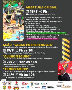 Na terça-feira (19), haverá a ação “Vagas preferenciais”, de conscientização quanto ao uso adequado desse tipo de ponto. A atividade ocorrerá no Supermercado Confiança (Avenida São Paulo, 2.717, no Além Ponte), das 9h às 10h. Ao passo em que, quarta-feira (20), das 12h às 13h, acontece, na Escola Municipal “Flavio de Souza Nogueira” (Rua Benedito C. de Barros, 47, na Vila Fiori), a atividade “Aluno Seguro”, para orientar sobre a utilização correta da faixa de pedestres. “Tempo Amigo”, iniciativa destinada à orientação de idosos sobre as regras e segurança no trânsito, será realizada na Santa Casa de Misericórdia de Sorocaba (Av. São Paulo, 750, no Além Ponte), das 9h às 10h de quinta-feira (21).