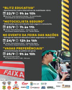 No sábado (23), a equipe da Semob promove a ação “Motociclista Seguro”, com orientações para esse público, no bolsão de estacionamento do Parque das Águas, no Jardim Abaeté, das 7h às 11h. O mesmo local, porém no domingo (24), sedia a Feira das Nações, evento onde haverá entrega de material educativo sobre segurança no trânsito, das 12h às 16h.