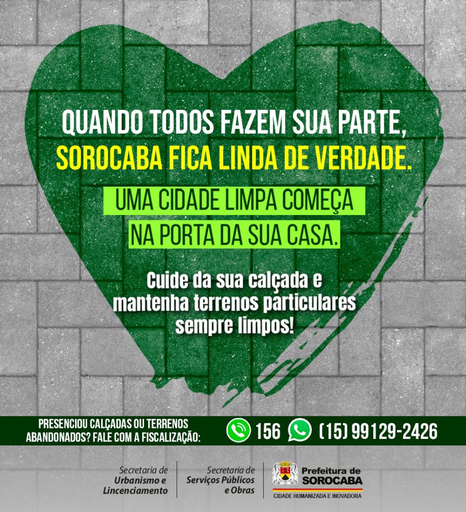 O Poder Público também segue fazendo a sua parte e cuidando das áreas públicas. Cada cidadão sorocabano também precisa colaborar para deixar a cidade sempre arrumada, começando pela porta de sua casa. Todo munícipe pode colaborar, mantendo sua calçada limpa, sem mato, entulho ou lixo, e zelando para que não haja buracos e desníveis no passeio.