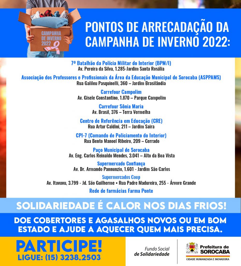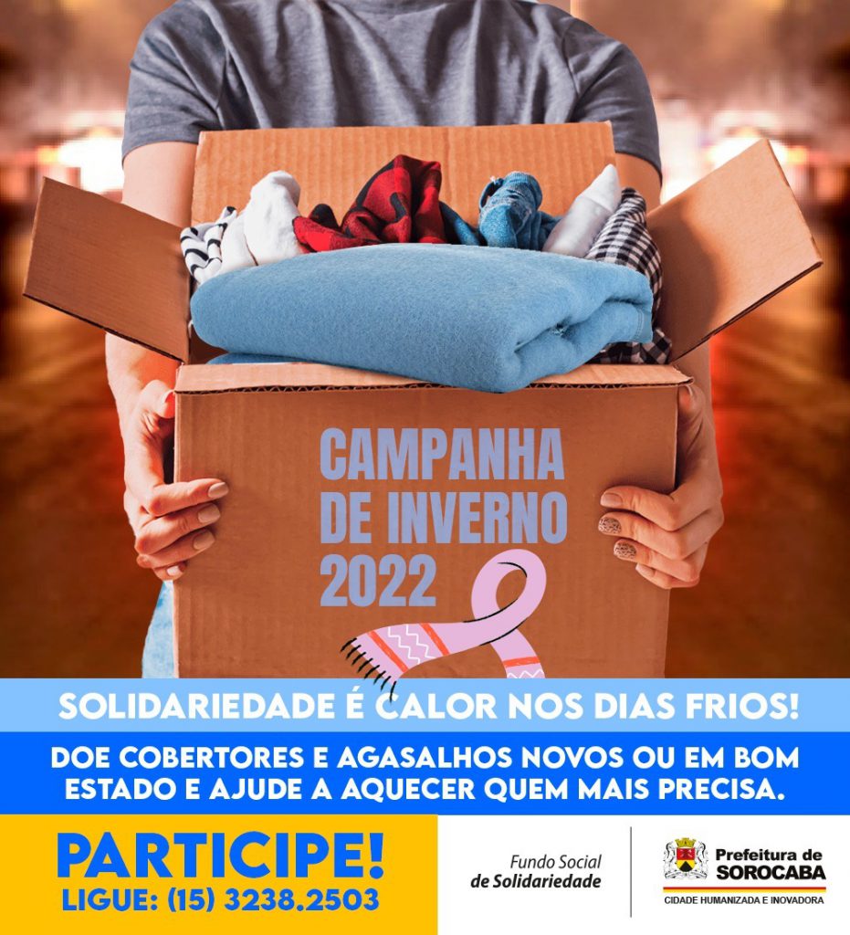 A Prefeitura de Sorocaba, por meio do Fundo Social de Solidariedade (FSS), lança, nesta segunda-feira (23), a Campanha de Inverno 2022, com o objetivo de arrecadar cobertores e agasalhos novos ou em bom estado para serem distribuídos a famílias em situação de vulnerabilidade social no município.